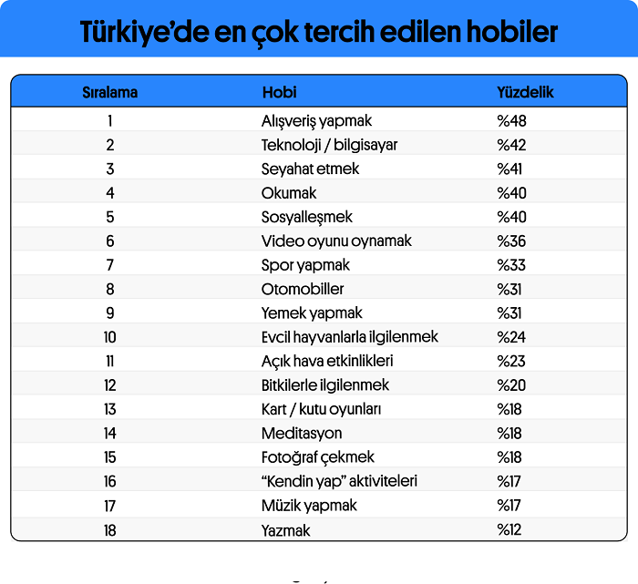 44 binden fazla yabancı dil öğretmenini tek platformda buluşturan ve İngilizce, Almanca, Fransızca, İtalyanca, İspanyolca online özel ders için tek durak olan Preply’nin dil ve kültür odaklı derlemelerinin en yenisi, dünya çapında en çok edinilen hobinin yemek yapmak olduğunu gösterdi. Buna karşın Statista verileri, Türkiye’deki katılımcıların %48’inin alışveriş yapmayı hobilerin ilk sırasına yerleştirdiği; alışveriş hobisini ise teknoloji, bilgisayar, seyahat etmek, okumak ve sosyalleşmek gibi başlıkların izlediğini gösterdi.