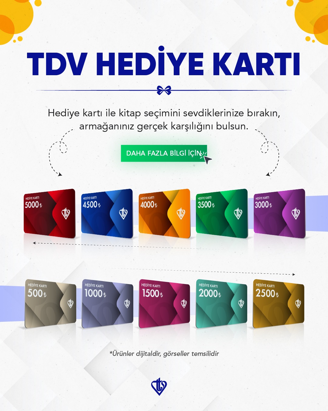 Türkiye Diyanet Vakfı Yayınları, nitelikli yayıncılık ilkeleri ile dijital çağın kolaylıklarını birleştiriyor. İslam kitapları, çocuk kitapları, genç kitapları ve hediyelik ürünlerdeki geniş yelpazesinden Hediye Kartı ile faydalanabilirsiniz. TL miktarına göre on farklı dijital kart olarak düzenlemiş olan Hediye Kartını satın almak için TDV e-satış sitesini ziyaret edebilirsiniz.